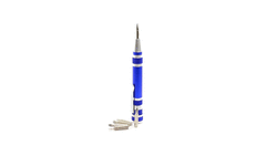 Multiutensile in alluminio con 6 accessori, con corpo antiscivolo e clip in metallo. Include 6 teste piatte e a stella. Confezionato singolarmente in scatola.