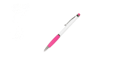 Elegante penna a sfera con meccanismo twist, con puntatore touch. Bicolore, dal design elegante con dettagli color argento lucido e corspo liscio e bianco. Clip in metallo e anello in tinta abbinata, impugnatura morbida e puntatore dai colori coordinati. Refill blu. Confezionata singolarmente in polybag.