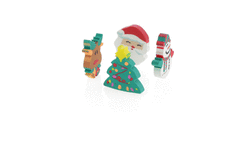 Set di gomme con disegni natalizi, confezionate in bustina trasparente richiudibile in PVC con catena per aggancio. Apposita area bianca per la stampa.